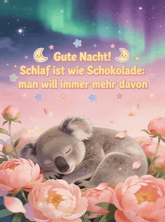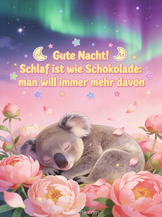 Teilen Sie ein Lachen vor dem Einschlafen mit dieser lustigen Karte mit einem schlafenden Koala zwischen Pfingstrosen unter einem Polarlicht-Himmel in Rosa und Grün mit einer witzigen Nachricht über Schlaf und Schokolade. Entdecken Sie auch Gute-Nacht-Bilder, einen Gute-Nacht-Gedanken oder eine süße Gute Nacht Nachricht.