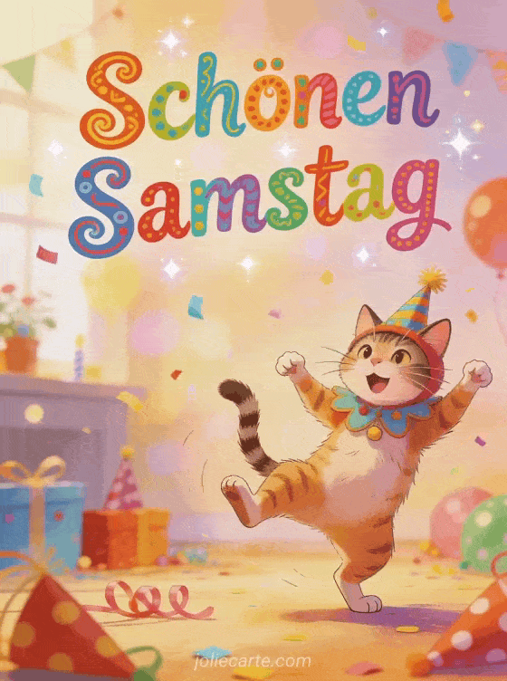 Verschicken Sie einen verrückt lustigen Samstagsgruß mit dieser witzigen Karte. Eine Katze in einem lächerlichen Kostüm tanzt wild mit Partydekoration überall. Entdecken Sie auch eine süße Samstagskarte mit Katze oder eine lustige Samstagskarte mit Frosch.