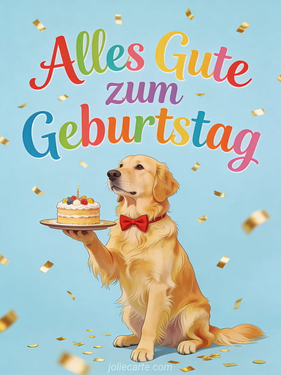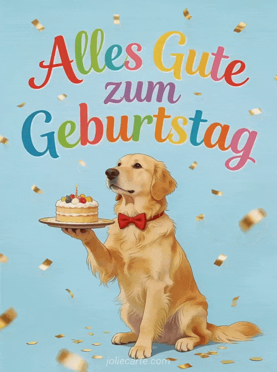Verschicke dieses fröhliche Geburtstags-GIF mit einem charmanten Golden Retriever mit roter Fliege, der einen Geburtstagskuchen trägt, mit goldenen Konfetti im Illustrationsstil. Eine kostenlose Karte für ihren Tag. Entdecke auch Geburtstagsfoto Frau oder kostenloser Geburtstagswunsch Frau.