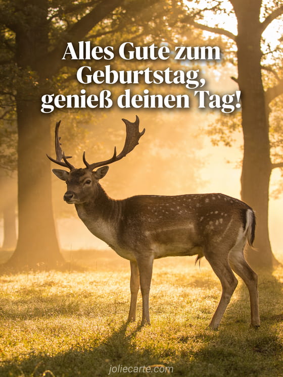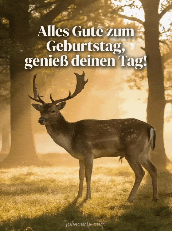 Verschicke dieses prachtvolle Geburtstags-GIF mit einem majestätischen Hirsch mit imposantem Geweih in einer taubedeckten Lichtung beim Sonnenaufgang, mit Lichtstrahlen durch die Bäume. Eine kostenlose Karte mit majestätischer Atmosphäre. Entdecke auch Geburtstagskarte Mann Sportwagen oder Geburtstagsglückwünsche für Männer.