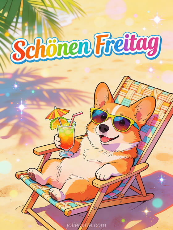 Teile ein Freitagslächeln mit einem lustigen Corgi, der eine große Sonnenbrille trägt und im Strandstuhl mit einem tropischen Getränk sitzt. Entdecke auch eine Freitagsküsse Karte, ein Bild mit Küsschen am Freitag oder Guten Morgen schönen Freitagmorgen.