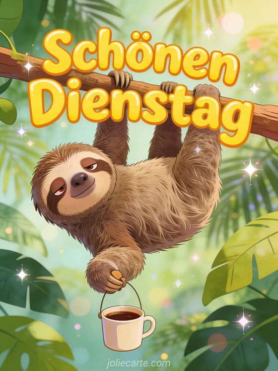 Bringe jemanden an diesem Dienstag zum Lachen mit dieser komischen Karte mit einem lustigen Faultier, das kopfüber hängt mit verschlafenem Gesichtsausdruck und einer baumelnden Kaffeetasse. Entdecke auch eine Karte schöner Dienstag Bild, eine Karte Gif schönen Dienstag Küsschen oder eine Karte schöner Dienstag mit Tieren.