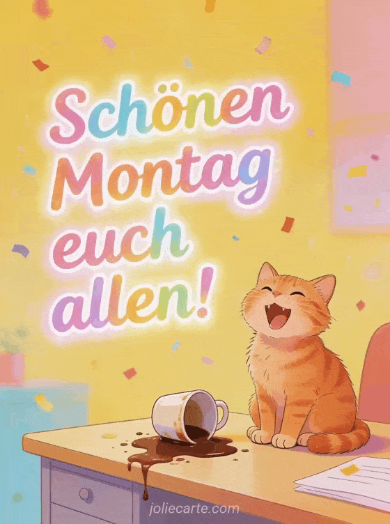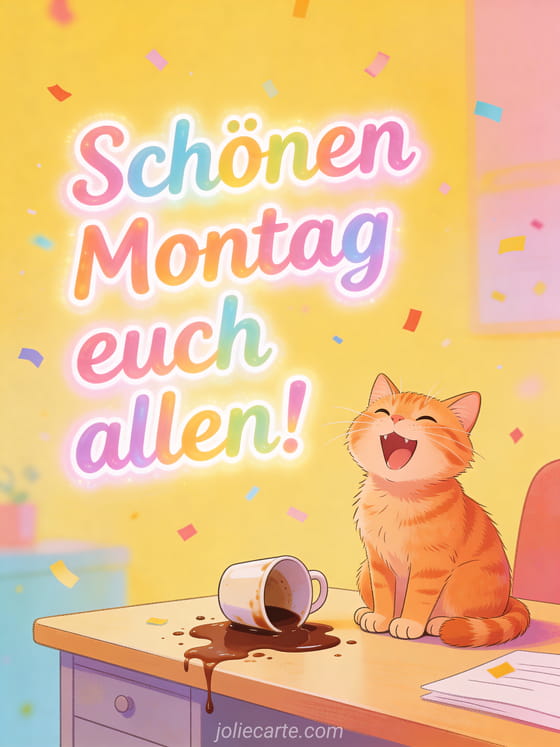 Starte die Woche mit einem Lächeln dank dieses schönen Montagsgrußes mit einer lachenden roten Katze und einer verschütteten Kaffeetasse. Entdecke auch ein Schönen Montag Katze Küsse Bild, Schönen Montag Regen Bilder oder Schönen Montag GIFs.