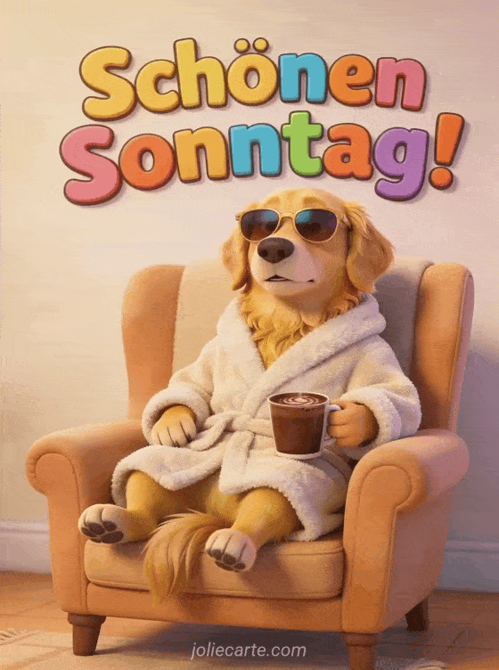 Bring jemanden zum Lächeln mit diesem lustigen Sonntagsgruß mit einem Golden Retriever im flauschigen Bademantel und mit Sonnenbrille. Entdecke auch eine Schönen Sonntag kostenlose animierte virtuelle Karte, Schönen Sonntag Küsschen Humor oder einen Schönen Sonntag verbringen.
