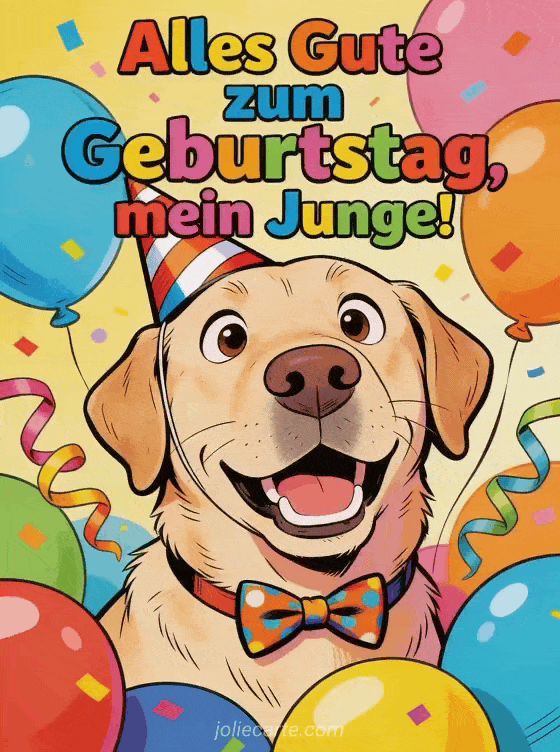 Bring deinen Sohn zum Lächeln mit einer lustigen Geburtstagskarte, die einen verspielten Labrador-Hund mit schiefem Partyhut und Fliege zeigt, umgeben von Ballons und Luftschlangen. Entdecke auch einen Geburtstagstext für meinen Sohn, ein Alles Gute zum Geburtstag mein Sohn Zitat oder eine Geburtstag für einen Sohn Karte.