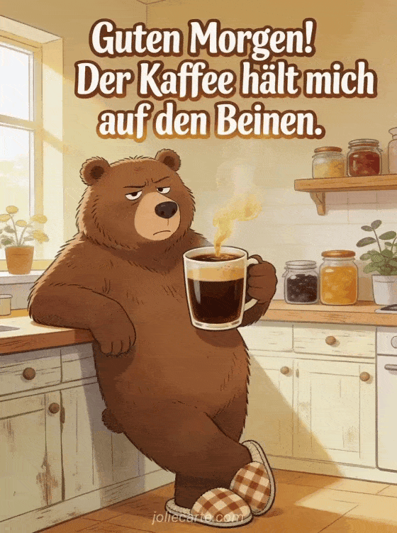 Kostenlose lustige Guten-Morgen-Karte mit Bär und Kaffee