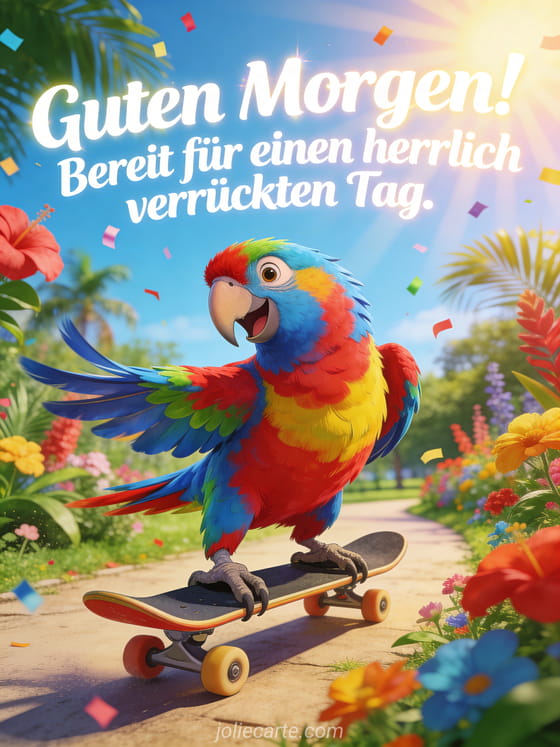 Starte mit diesem lustigen Guten Morgen Bild mit einem Ara-Papagei auf dem Skateboard in den Tag. Schau auch mal bei kostenloses lustiges Guten Morgen GIF oder lustiges Guten Morgen GIF vorbei.