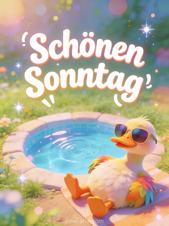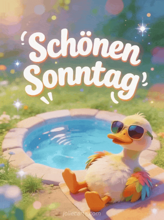Teile ein lustiges Schönen-Sonntag-GIF mit einer Ente, die übergroße Sonnenbrillen trägt und an einem winzigen Pool in einer absurden Sommerszene entspannt. Halte den Sonntag fröhlich mit Schönen Sonntag Freundschaft, Schönen Sonntag im Herrn oder Schönen Sonntag animiertes glitzerndes GIF.