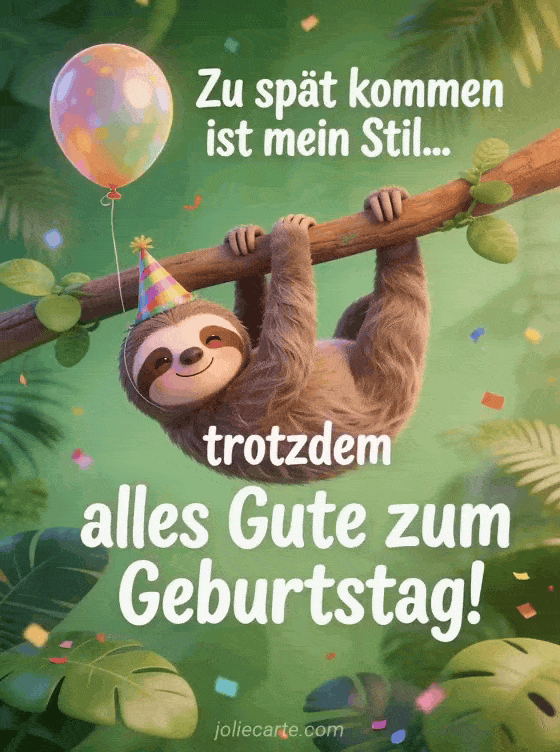Zu spÀt kommen ist mein Stil! Senden Sie diese lustige nachtrÀgliche Geburtstagskarte mit einem fröhlichen Faultier und Ballons. Entdecken Sie auch eine nachtrÀgliche Geburtstagskarte mit Katze oder eine nachtrÀgliche Geburtstagskarte mit Blumen.