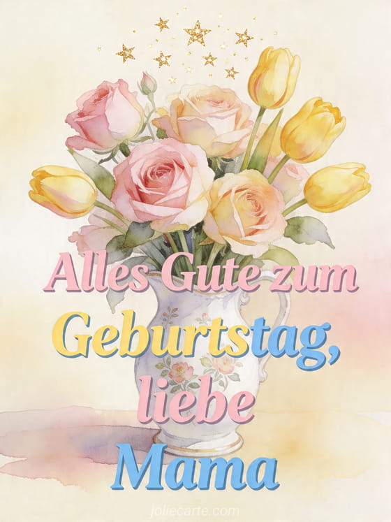 Sende deiner Mama einen liebevollen Geburtstagswunsch mit dieser zarten Aquarellkarte mit alten Rosen und Tulpen in einer feinen Vase. Entdecke auch rührende mama alles gute zum geburtstag karte, herz herz alles gute zum geburtstag mama und mama geburtstag grußkarte.