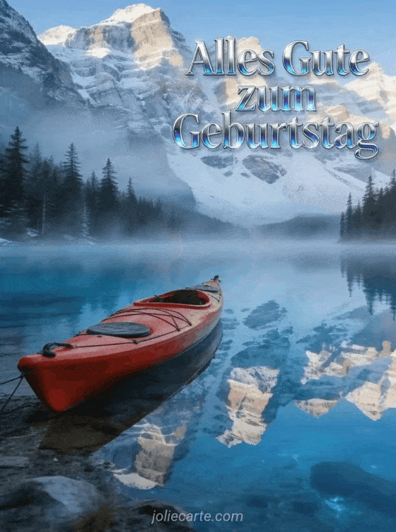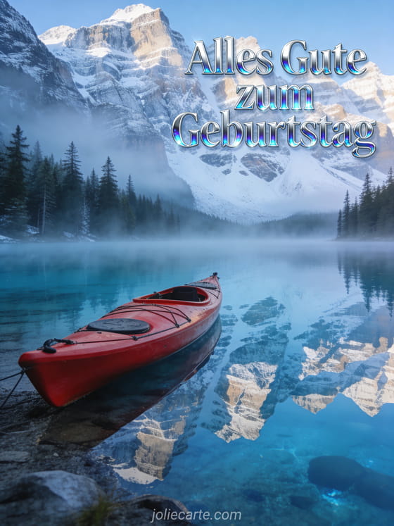 Schicke eine beeindruckende Geburtstagskarte mit einem roten Kajak an einem kristallklaren Bergsee bei Sonnenaufgang, mit perfekten Spiegelungen verschneiter Gipfel. Entdecke auch eine lustige kostenlose Geburtstagskarte für einen Mann oder Alles Gute zum Geburtstag Mann.