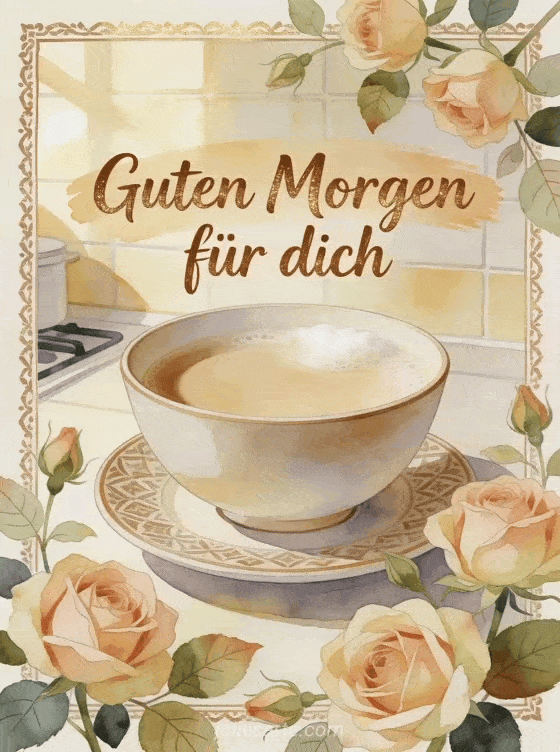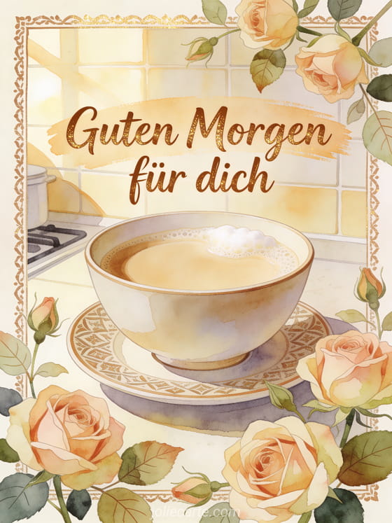 Sende Milchkaffee Guten Morgen mit cremig brauner Schrift, alten Rosen und einer Keramikschale mit Milchkaffee auf einer gemusterten Untertasse. Du kannst auch guten morgen kaffee bild, Guten Morgen guter Kaffee am Morgen oder herz gif guten morgen kaffee teilen.