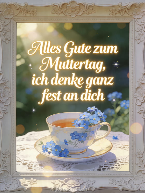 Teile eine elegante Muttertagskarte mit cremefarbener Kalligrafie, einer fotorealistischen Teetasse, blauen Vergissmeinnicht, Spitze und einem geschnitzten Blumenrahmen. Entdecke auch ein Bild zum Muttertag, ein Motiv zum Muttertag oder Muttertag Bilder gratis.