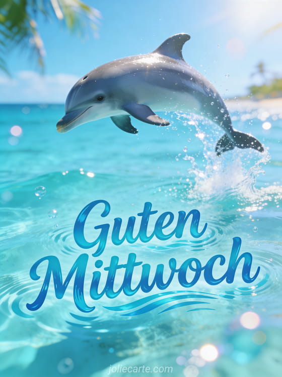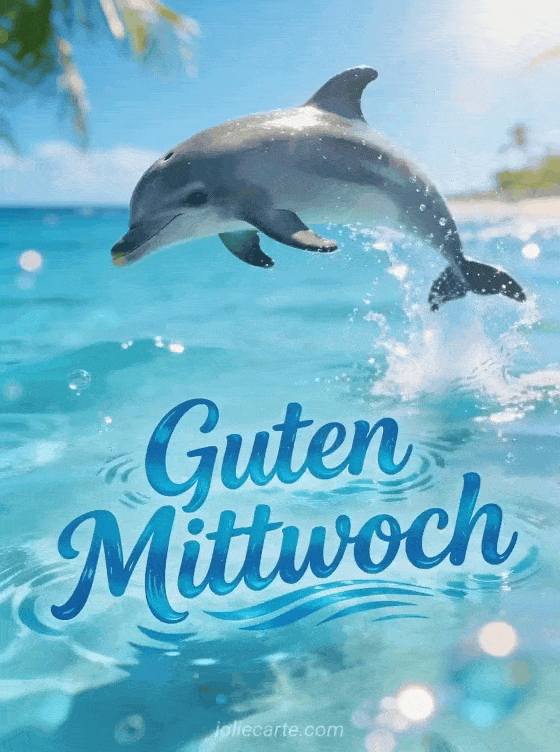 Teile einen fröhlichen Mittwochswunsch mit diesem energischen animierten Gif mit einem verspielten Delfin, der aus dem kristallklaren türkisfarbenen Wasser springt. Entdecke auch guter kleiner mittwochskaffee oder animiertes Küsschen Gif guter Mittwoch für mehr Inspiration.