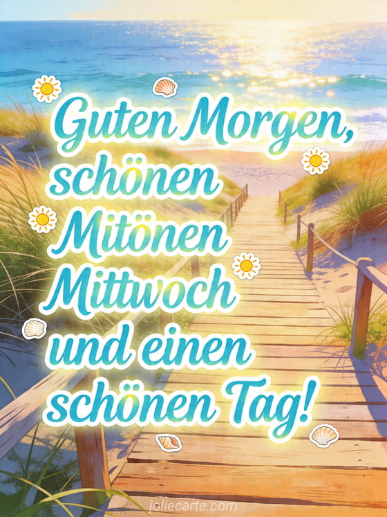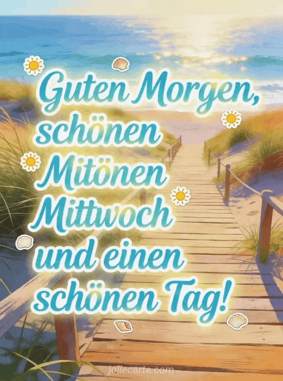 Guten Morgen, schönen Mittwoch und einen schönen Tag! ein fröhlicher Mittwochsgruß mit Sonne und Meer