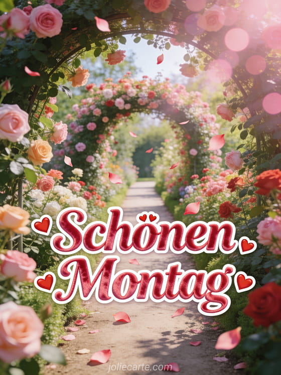 Teilen Sie eine romantische Karte zum schönen Montag mit rosig roter Samtschrift, kleinen roten Herzen, Rosenblättern und einem üppigen Rosengarten mit einem Weg unter einem Bogen aus Kletterrosen. Entdecken Sie auch diese Guten Morgen Montag Karte, Guten Morgen schönen Montag Kaffee oder ein schönen Montag gute Woche GIF.