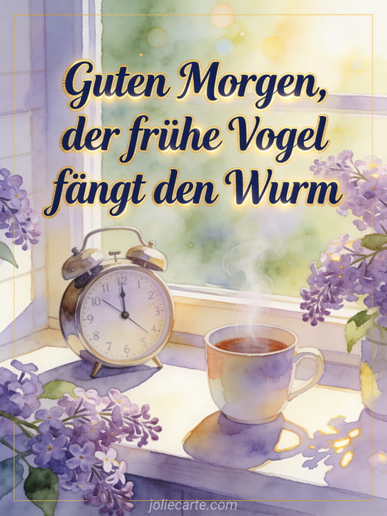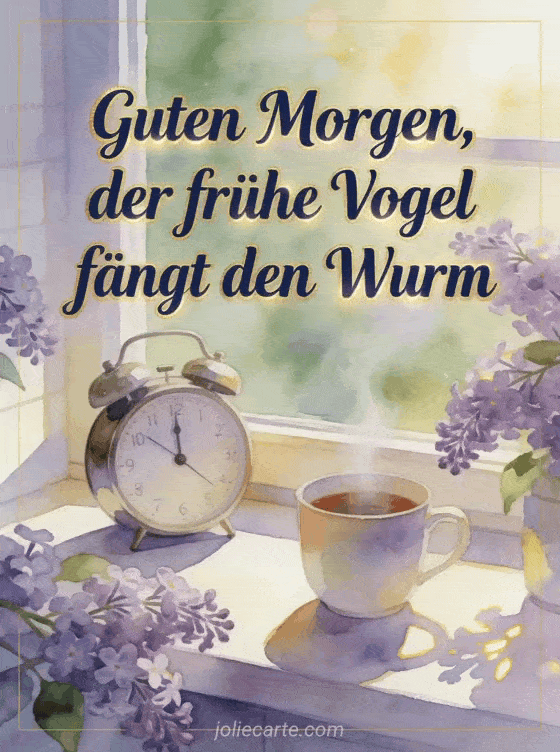 Sende eine morgendliche Guten-Morgen-Nachricht mit klarer marineblauer Aquarellschrift, einer fröhlichen Küchenfensterbank, einem Vintage-Wecker, einer dampfenden Tasse und frischen Fliederzweigen. Entdecke auch animierte virtuelle Guten-Morgen-Karte, eine Guten-Morgen-Nachricht für meine Freundin oder kostenlose Guten-Morgen-Karten.