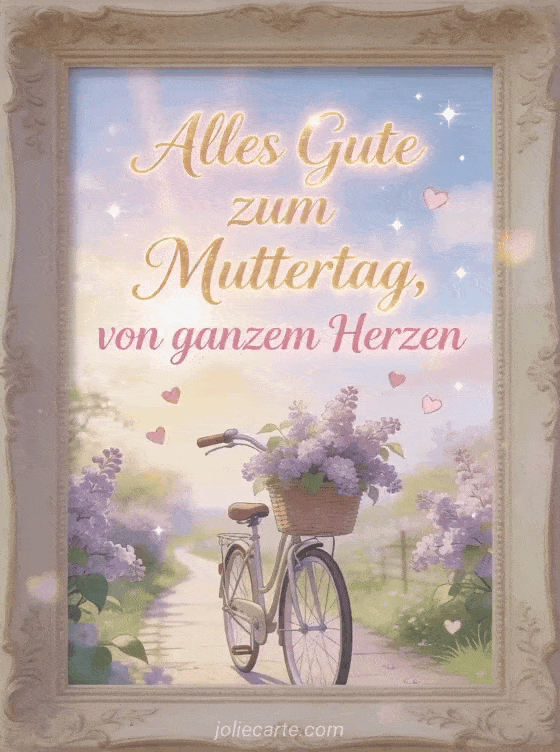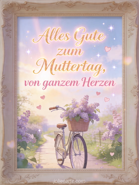 Teilen Sie eine fröhliche Muttertagskarte mit einer charmanten Dorfgasse, einem Vintage-Fahrrad, duftendem Flieder und kleinen schwebenden Herzen. Entdecken Sie auch Muttertag Bilder gratis, Muttertagsreime oder Reime zum Muttertag.