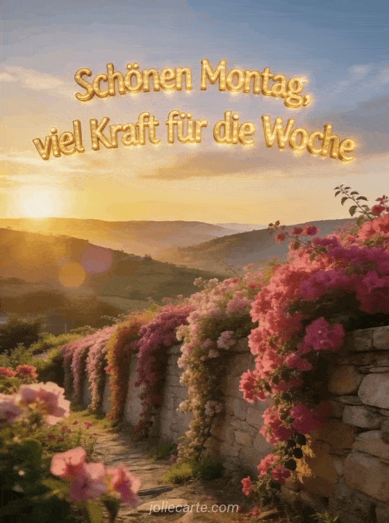 Mache Mut für die Woche mit dieser leuchtenden Karte, die ein blühendes Tal im goldenen Sonnenaufgang mit herabfallender Bougainvillea und weitem Hügelpanorama zeigt. Entdecke auch guten morgen montag lustig, ein schöner montag oder guten morgen schönen montag schöne woche küsschen.