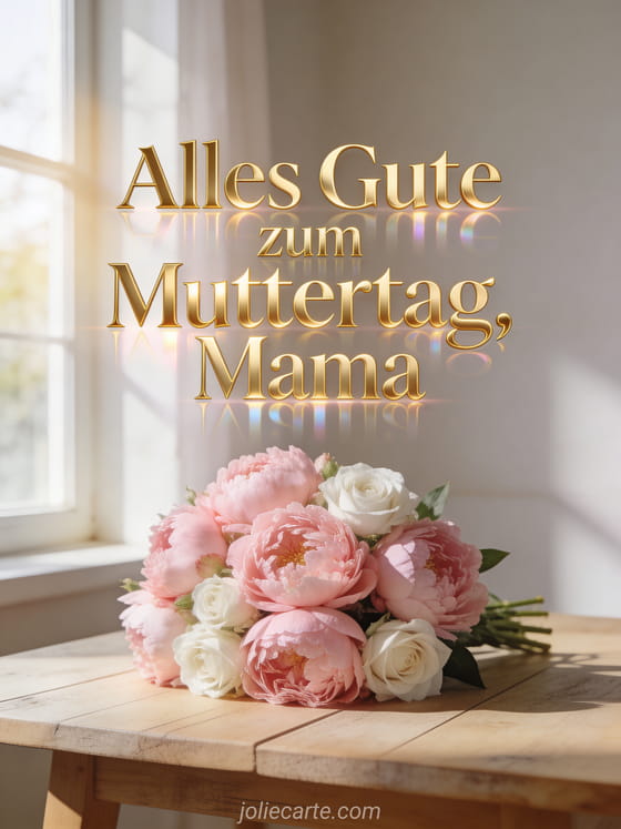Teile diese wunderschöne Muttertagskarte mit einem prächtigen Strauß aus rosa Pfingstrosen und weißen Rosen im Morgenlicht. Entdecke auch Muttertag wünschen oder originelle Muttertagskarte.