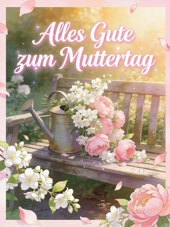 Begeistere Mama mit dieser prachtvollen Blumenkarte mit Jasmin und rosa Pfingstrosen aus einer alten Gießkanne im warmen Morgenlicht. Entdecke auch kostenloses Muttertagsbild oder schöner Muttertag Mama.