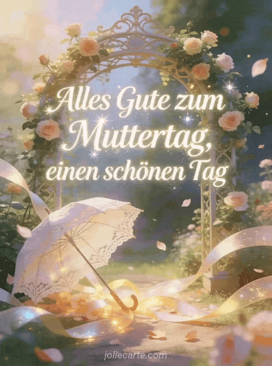 Schenken Sie einen schönen Muttertagsmoment mit einem anmutigen illustrierten Gartenbogen, alten Rosen, schwebenden Blütenblättern und festlichen Bändern. Entdecken Sie auch Nachrichten zum Muttertag, Poesie zum Muttertag Küsse oder eine Grußkarte Muttertag.