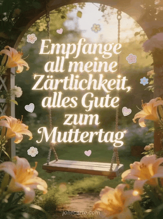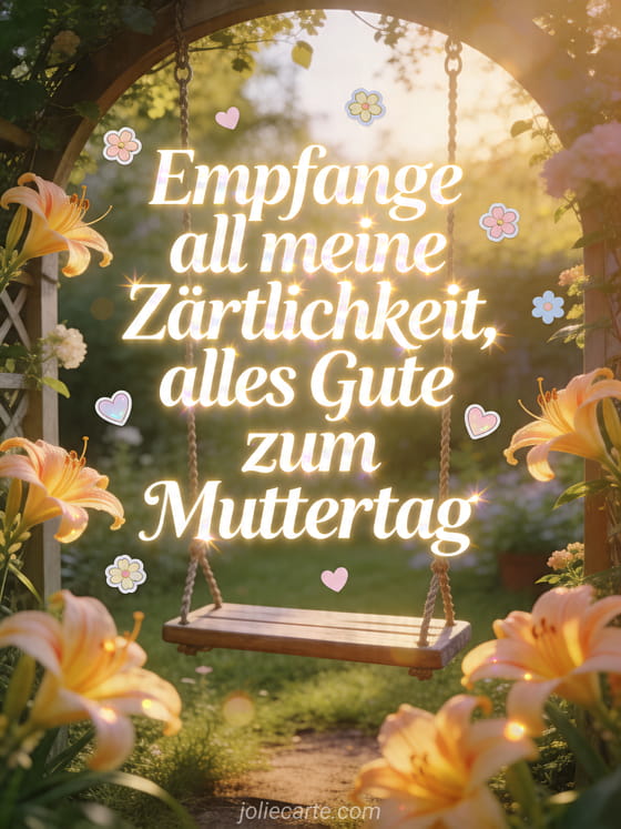 Teile einen ruhigen Gruß mit einer Gartenschaukel, gerahmt von leuchtenden Taglilien, kleinen Blüten und pastellfarbenen Herzen im warmen Nachmittagslicht. Dazu passen Muttertagsgedichte, Muttertag Wortspiel oder Alles Gute zum Muttertag meine Schwiegertochter.