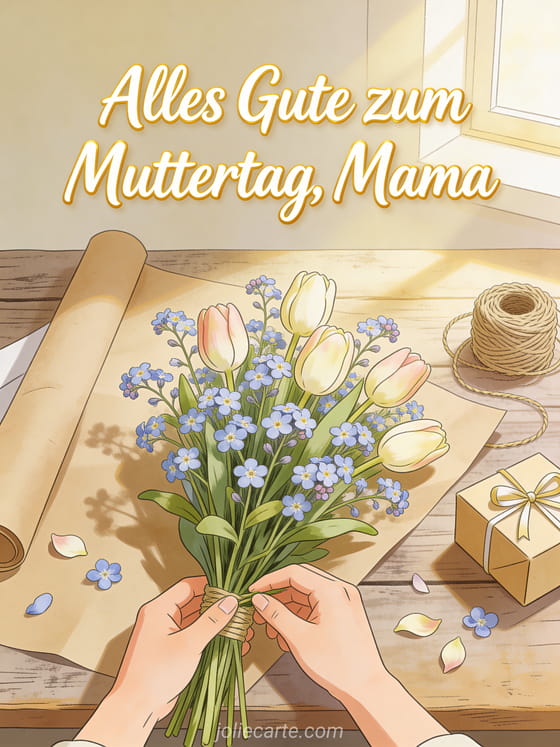 Teile diese warme Karte und feiere Mama mit Blumen und Liebe. Entdecke auch Dankesnachricht zum Muttertag, alles Gute zum Muttertag meine Liebste oder Gedicht für Mama Muttertag.