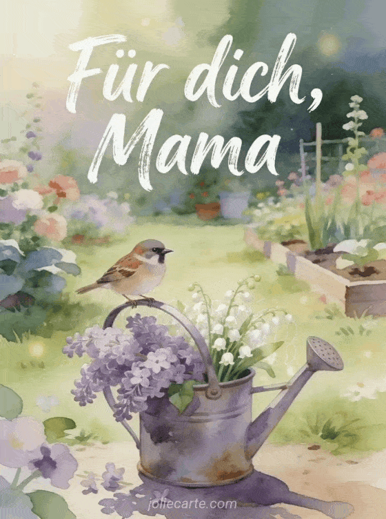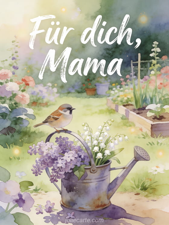 Überrasche Mama mit dieser schönen Aquarellkarte mit einem Spatz auf einer alten Gießkanne mit Flieder und Maiglöckchen. Entdecke auch Muttertag Glückwunsch oder eine Muttertagsgrußkarte.