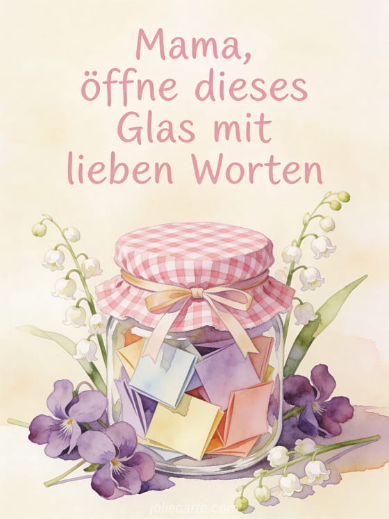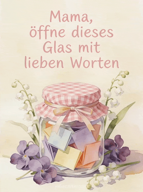 Sende diese zärtliche Muttertagskarte wie ein Glas voller liebevoller Worte. Entdecke auch schönen Sonntag zum Muttertag, Einladung Muttertag und Karte schöner Muttertag.