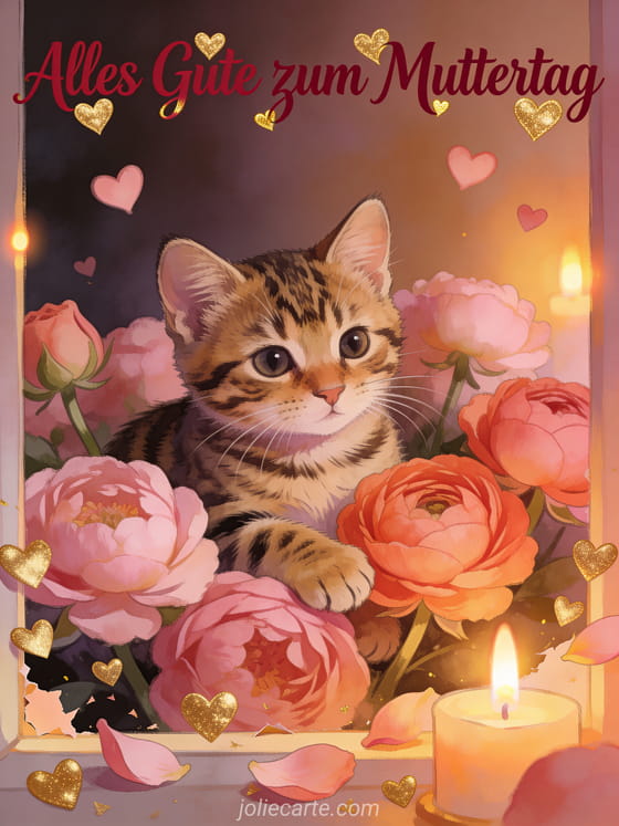 Zeige deine Liebe mit dieser romantischen Muttertag mein Schatz Karte. Ein Bengal-Kätzchen zwischen rosafarbenen und korallenfarbenen Ranunkeln mit schwebenden goldenen Herzen. Entdecke auch eine Muttertag Karte Vorlage oder eine Muttertagskarte.