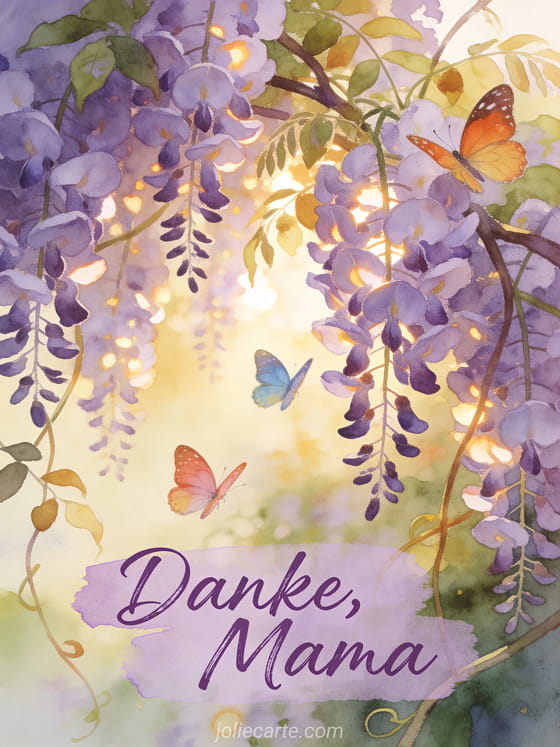Teile diese poetische Muttertagskarte mit lila Aquarellbuchstaben in einem wunderschönen Glyziniengarten mit Schmetterlingen und goldenem Licht. Entdecke auch Bilder froher Muttertag oder Muttertagskarten kostenlos.