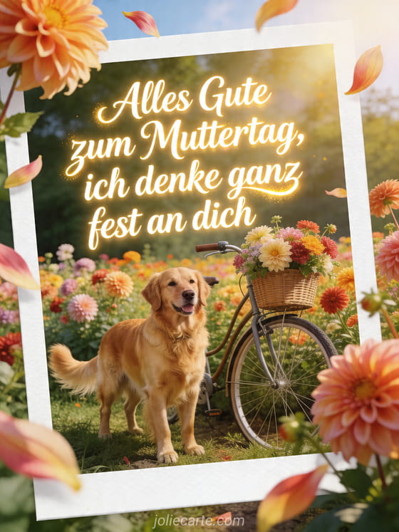 Teile Muttertagsbotschaften auf einer sonnigen realistischen Karte mit einem Golden Retriever Hund auf einer Dahlienwiese neben einem alten Fahrradkorb. Entdecke auch eine Fotografie zum Muttertag, eine Zeichnung zum Muttertag oder liebe Worte zum Muttertag.