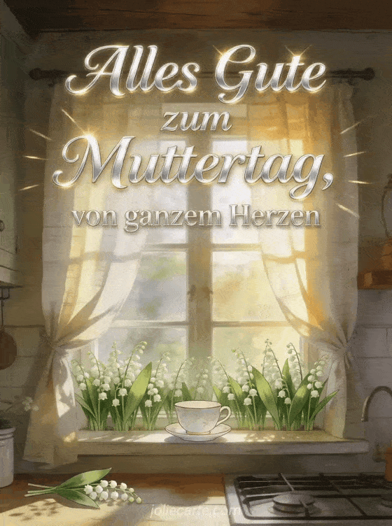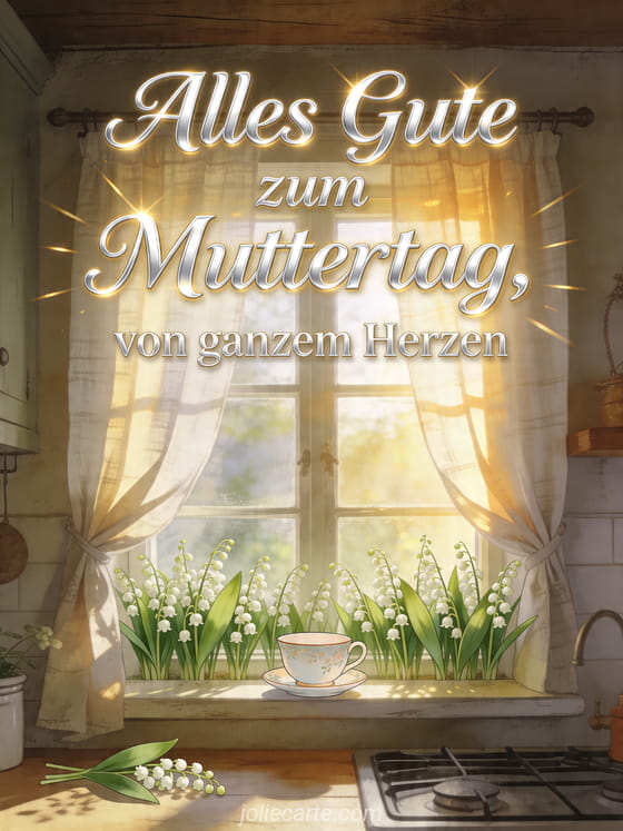 Teile einen friedlichen Gruß mit einem rustikalen Küchenfenster, gesäumt von Maiglöckchen, einer Porzellantasse und sonnenbeschienenen Leinenvorhängen. Dazu passen wie man seiner Mama alles Gute zum Muttertag wünscht, Muttertag Foto oder Muttertagsgedicht.