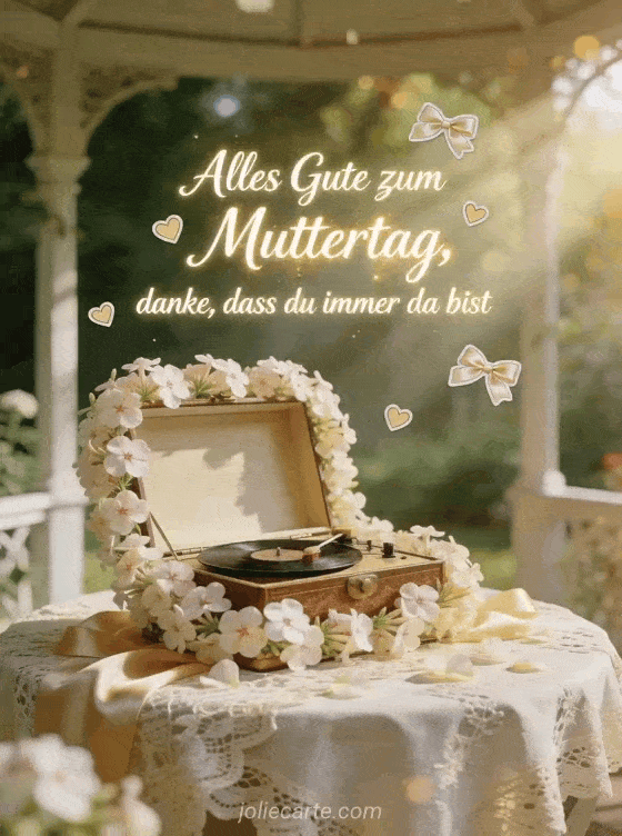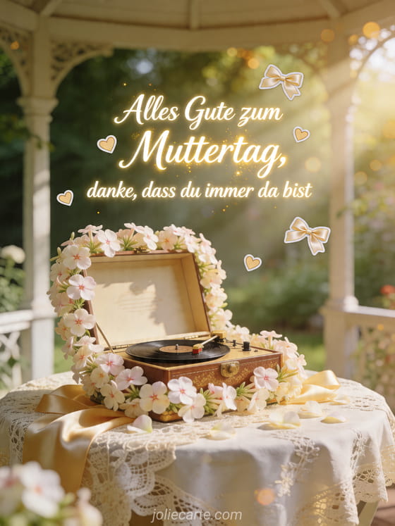 Danke mit einer verträumten Karte, die eine blühende Phlox-Einfassung um eine offene Spieluhr auf einem Spitzentisch in einem Gartenpavillon zeigt. Dazu passen Muttertag Poesie, Zeichnungen zum Muttertag oder Muttertag Gedichte.