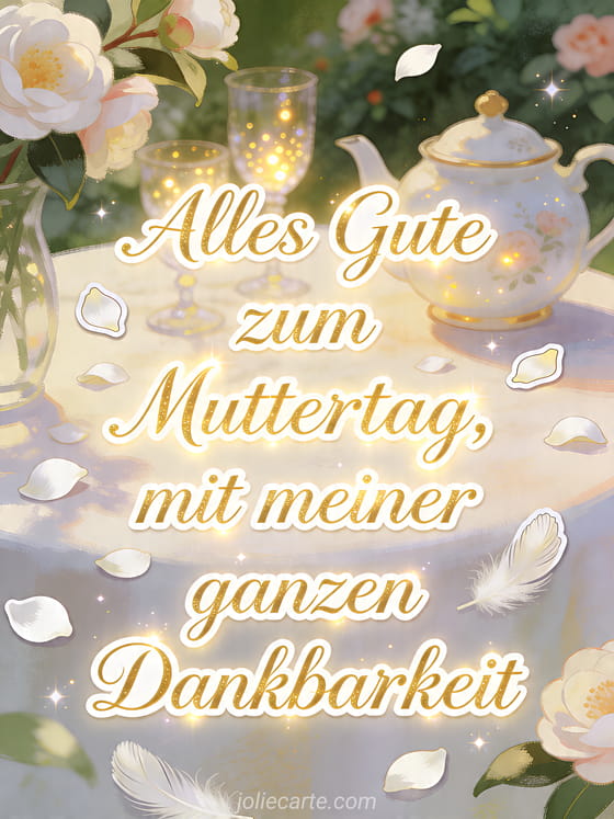 Teile eine leuchtende Muttertagskarte mit einem Kamelien-Gartentisch, Porzellanteekanne, glänzendem Glas und weichen Blütenblättern. Dazu passen Muttertag Wortspiel, Alles Gute zum Muttertag meine Schwiegertochter oder Alles Gute zum Muttertag.