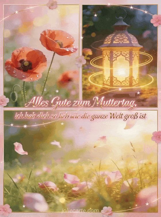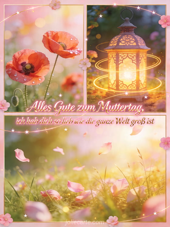 Teile eine strahlende Muttertagskarte mit roségoldener Schrift, leuchtenden Mohnblumen, einer glühenden Gartenlaterne, schwebenden Blütenblättern und einer sonnigen Wiese. Entdecke auch Texte zum Muttertag, Alles Gute zum Muttertag Bilder oder Fotografien zum Muttertag.