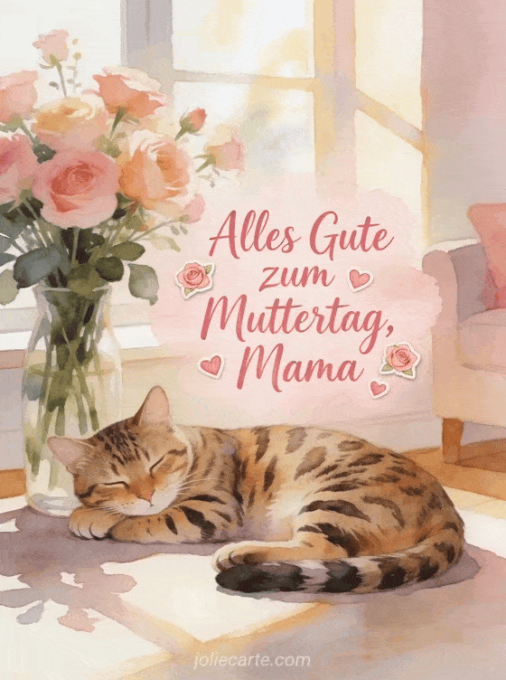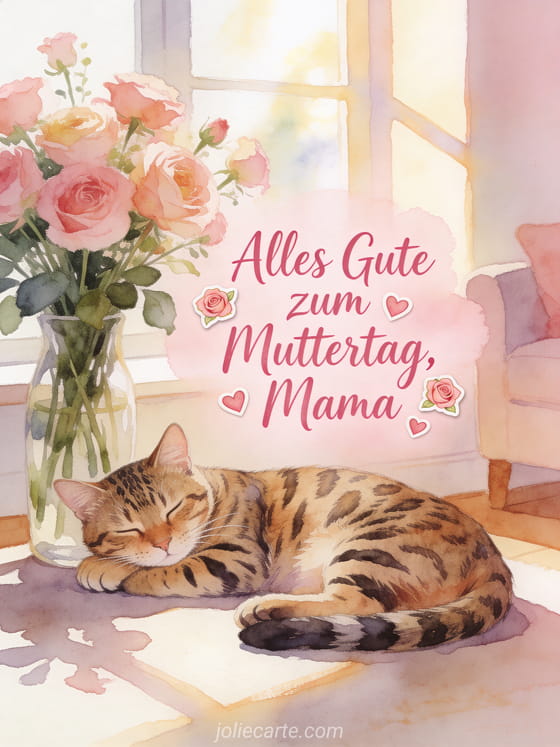 Überraschen Sie Mama mit dieser wunderschönen Muttertagsgrußkarte mit sanfter rosa Aquarellkalligraphie und einer Bengalkatze neben duftenden Nelken. Entdecken Sie auch Muttertagsnachricht Grüße oder schöner Muttertag Tag.