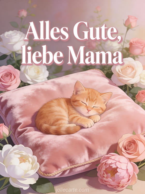Überrasche Mama mit dieser sanften Karte mit einem entzückenden roten Kätzchen, das zwischen Rosen und Pfingstrosen schläft. Entdecke auch gif alles gute zum Muttertag oder kurzes Muttertag Gedicht.