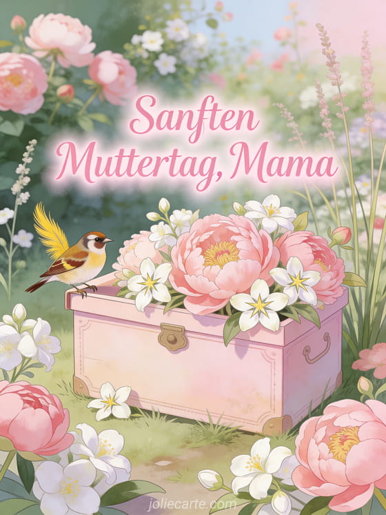 Begeistere Mama mit dieser eleganten Karte mit einem Stieglitz auf einem pastellrosa Vintage-Briefkasten voller Pfingstrosen und Jasmin. Entdecke auch eine originelle Muttertagskarte oder eine Muttertagskarte kostenlos.