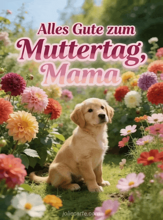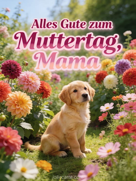 Teile diese fröhliche kostenlose Muttertagskarte. Ein Golden Retriever Welpe sitzt in einem Garten aus bunten Dahlien und Cosmos und blickt zärtlich in die Kamera. Entdecke auch eine Muttertag Blumen Karte oder eine Muttertagskarte.