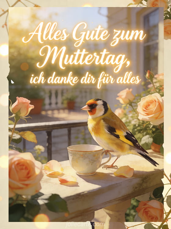 Danke Mama für alles mit einer leuchtenden Terrassenszene, in der ein Stieglitz neben einer Porzellantasse sitzt, umgeben von blühenden Rosen. Dazu passen kleine liebe Worte zum Muttertag, Muttertagsfest oder wie man seiner Mama alles Gute zum Muttertag wünscht.