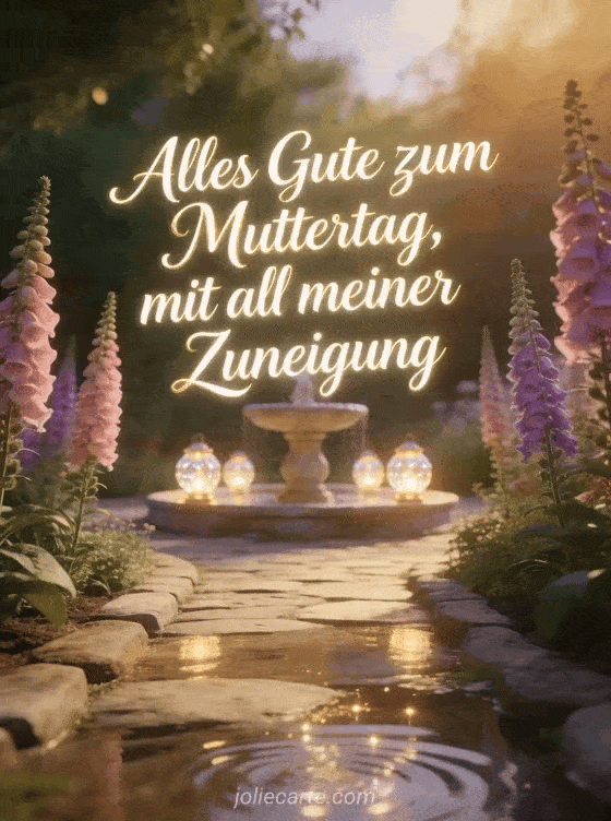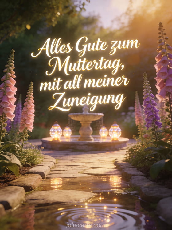Teile Muttertagspoesie auf einer eleganten Karte mit sonnigem Gartenweg, hohem Fingerhut, Steinbrunnen und Kristalllaternen. Entdecke auch ein Kompliment zum Muttertag, wie du deiner Mama alles Gute zum Muttertag wünschst oder Alles Gute zum Muttertag für eine verstorbene Mama.
