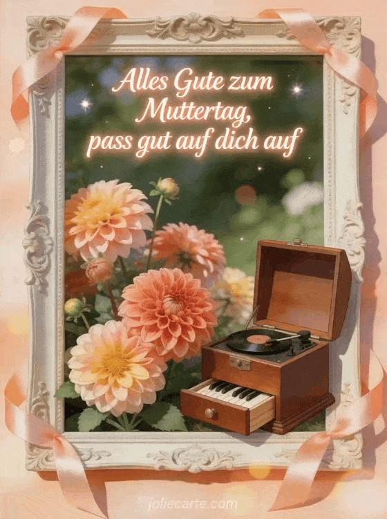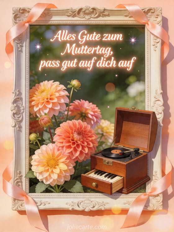 Teile einen Muttertagstext mit glatter elfenbeinfarbener Kalligrafie, sanftem Pfirsichleuchten und einer fotorealistischen offenen Spieluhr neben frischen Dahlien. Satinschleifen und geschnitzte Details machen diese Karte zu einem liebevollen Gruß: pass gut auf dich auf. Entdecke auch Gedicht für die Mutter, Fotos zum Muttertag oder Muttertagswünsche.