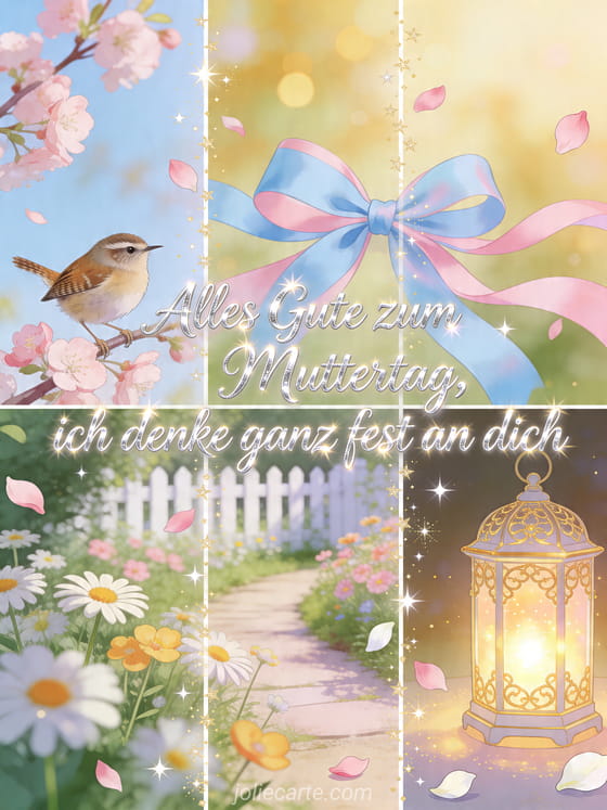 Teile Muttertagswünsche auf einer vierteiligen illustrierten Karte mit einem kleinen Zaunkönig, blühenden Zweigen, einer Schleife, einem Gartenweg und einer leuchtenden Laterne. Entdecke auch eine Skizze zum Muttertag, Fotos vom Muttertag oder Muttertagspoesie.