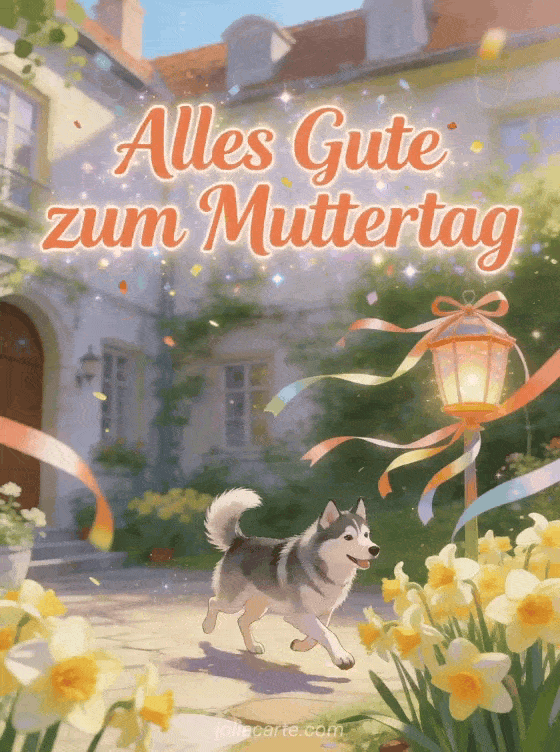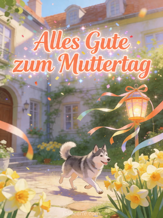 Teile eine verspielte Muttertagskarte mit korallfarbener Schrift, einem Husky-Hund zwischen Narzissen, einer Laterne mit Schleife, flatternden Girlanden und leuchtenden Frühlingsfarben. Entdecke auch Gedichte zum Muttertag, Muttertagsbilder oder eine Muttertagszeichnung.