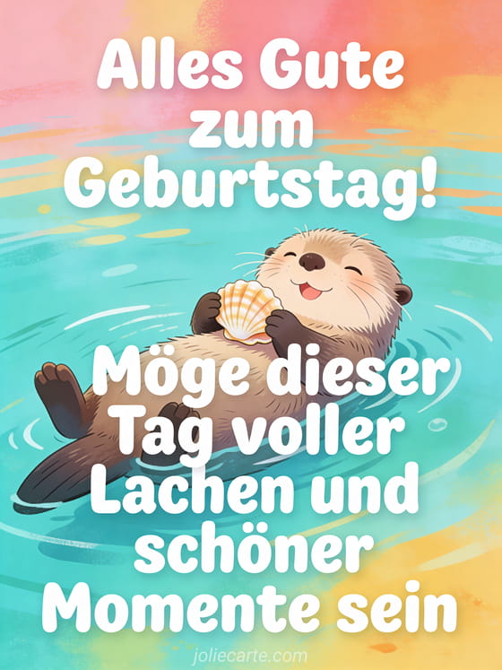 Teile eine lustige maritime Geburtstagskarte mit einem friedlichen Otter, der auf dem Rücken in türkisfarbenem Wasser treibt und eine Muschel zwischen den Pfoten hält. Entdecke auch eine Alles Gute zum Geburtstag Alles Gute zum Geburtstag mein Sohn Karte, eine SMS um meinem Sohn Alles Gute zum Geburtstag zu wünschen oder eine Geburtstagskarte mein Sohn.