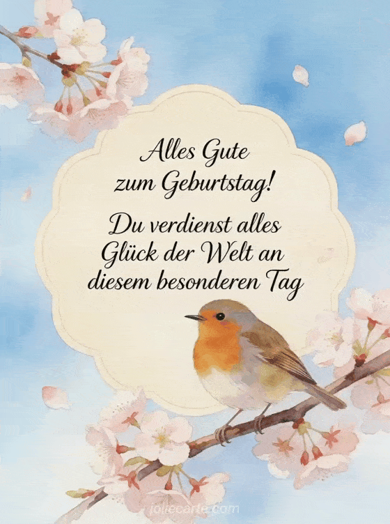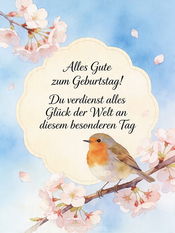 Sende einen zarten Geburtstagsgruß mit dieser feinen Aquarellkarte mit einem Rotkehlchen auf einem blühenden Kirschzweig unter einem sanften Frühlingshimmel. Entdecke auch geburtstagstext, Nachricht um alles Gute zum Geburtstag zu wünschen und Text für Geburtstag.