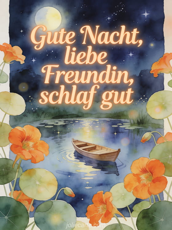 Sende einer lieben Freundin eine friedliche Gute-Nacht-Nachricht mit warmer apricotfarbener Schrift, einem kleinen Holzboot auf einem spiegelnden Teich, einem Sternenhimmel, Kapuzinerkresse, orangefarbenen Blütenblättern und weichem Bokeh. Teile auch eine Karte zum Gute-Nacht-Wünschen, eine Gute-Nacht-Karte oder eine schöne gute nacht nachricht.