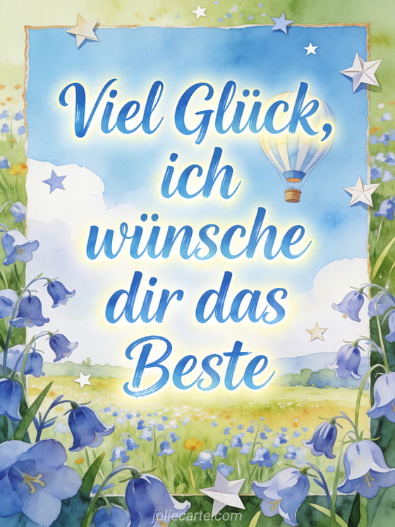 Teile Viel Glück, ich wünsche dir das Beste mit himmelblauer Schrift, einem Heißluftballon über einer hellen Wiese, Glockenblumen und schwebenden Papiersternen. Entdecke auch Viel Glück für die Prüfungen Bild, Viel Glück für alles Weitere Bild oder Viel Glück Katze Bild.